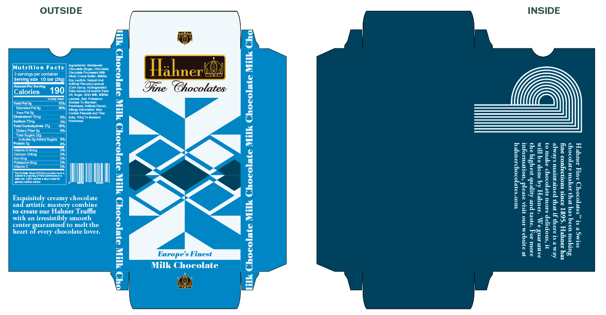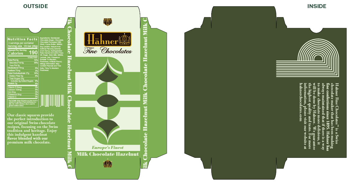 With Hahner Fine Chocolates I was interested in incorporating swiss design into the packaging. I spent a lot of my time during the early stages of development testing out different pattern ideas. I tried out a lot of different geometric shapes and different colors. The hardest part was making the pattern not feel too complicated or too simple. I finally created the pattern for the dark chocolate almond bar and fell in love with the concept I had created. The pattern worked wonderfully as the front of th1e bars.