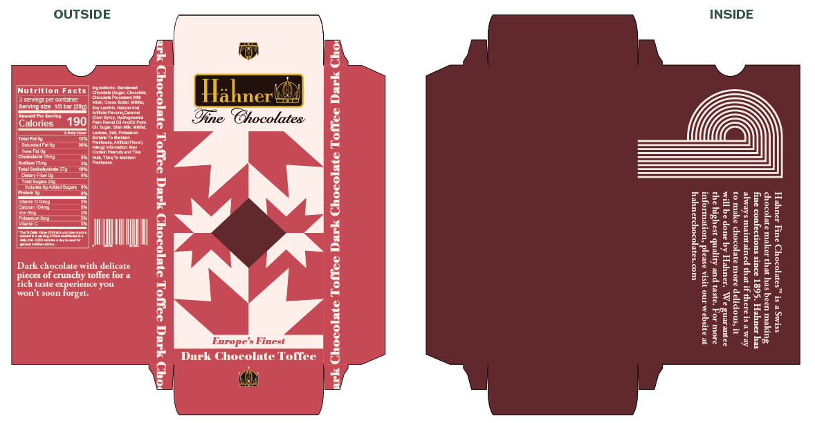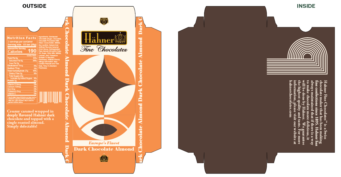 With Hahner Fine Chocolates I was interested in incorporating swiss design into the packaging. I spent a lot of my time during the early stages of development testing out different pattern ideas. I tried out a lot of different geometric shapes and different colors. The hardest part was making the pattern not feel too complicated or too simple. I finally created the pattern for the dark chocolate almond bar and fell in love with the concept I had created. The pattern worked wonderfully as the front of th1e bars.